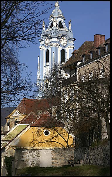 The blue Baroque tower of Stiftskirch is a kind of signature of Durnstein.
