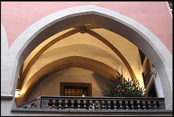 This entryway is located in an interior courtyard. Christmas decorations adorned the courtyard.
