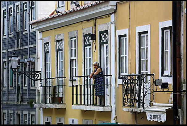 A breath of fresh air and a look at the neighborhood gives this woman a pause in her day.