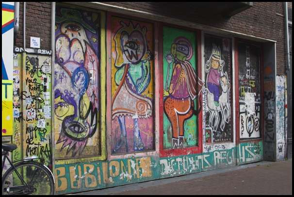 Colorful paint covers the walls on a street. Is is art or comment, or both?