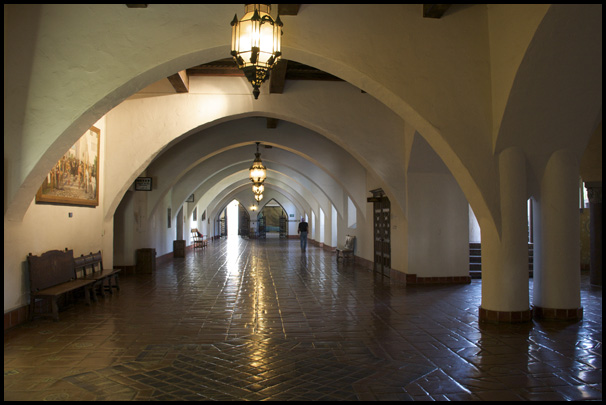 The arched hallway in the court house had one man pacing up and down.